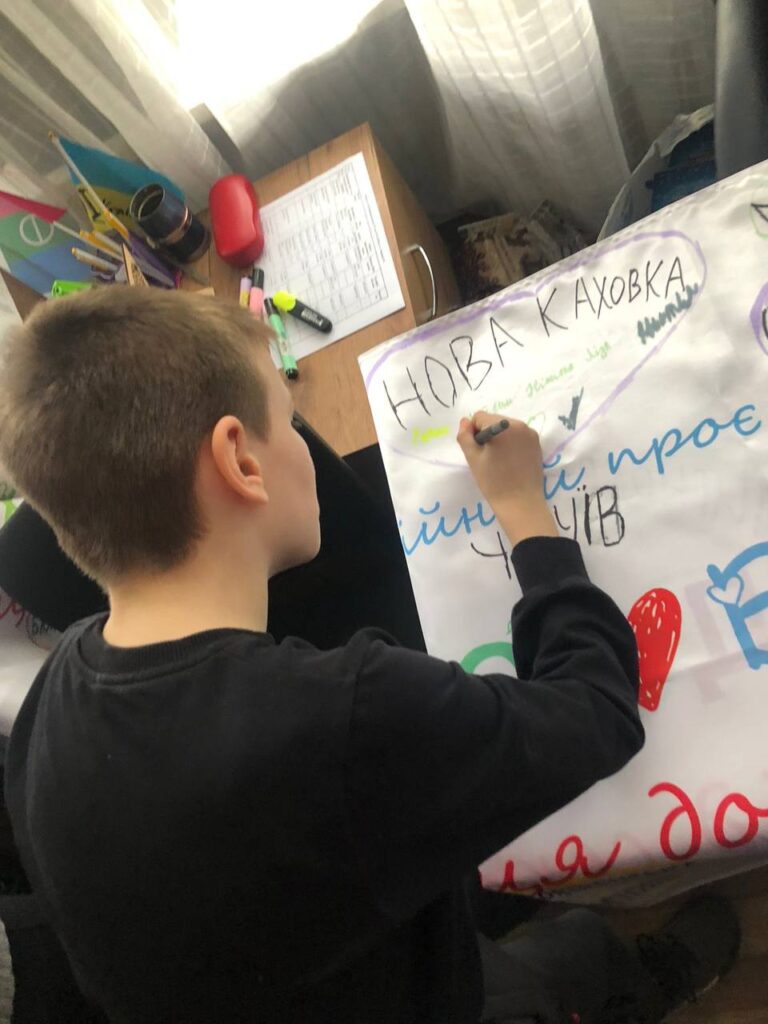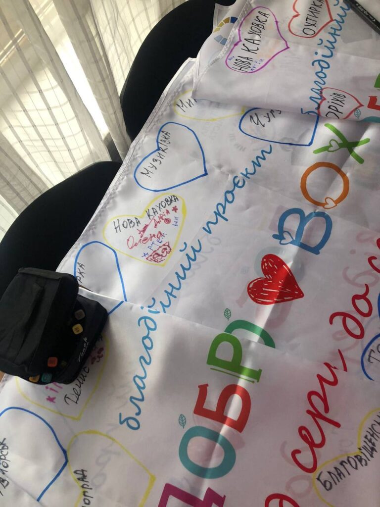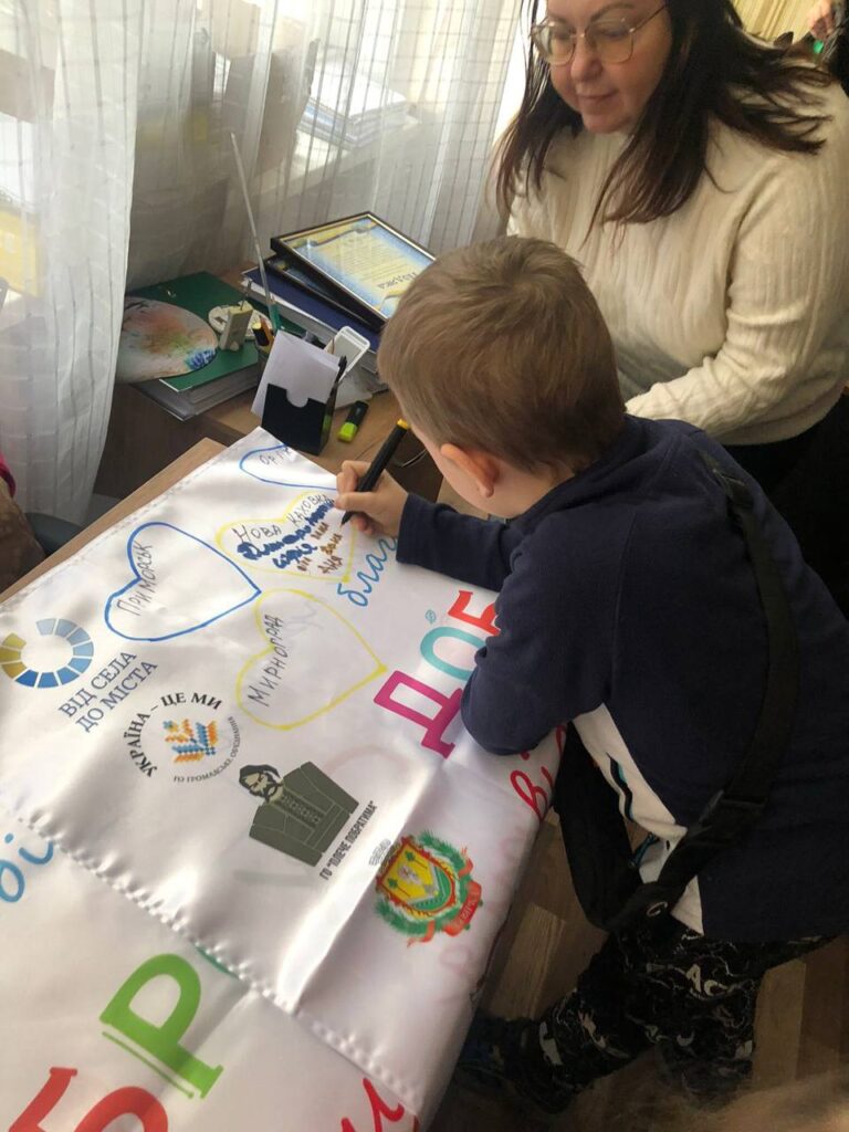На великому прапорі ми намалювали серця з назвами громад і кожна дитина шукала своє місто, залишала там підпис, малюнок чи побажання. Це стало символом того, що попри відстань – ми поруч.